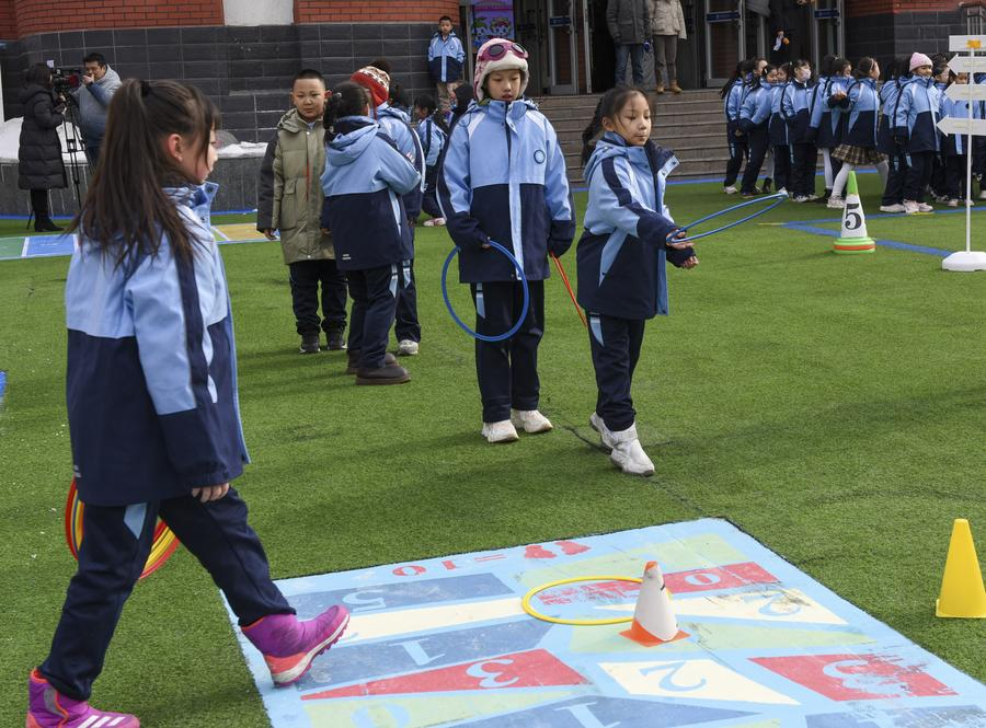 Students play games at a primary school in Urumqi, northwestern China's Xinjiang Uygur autonomous region, Feb. 17, 2025. [Photo/Xinhua]