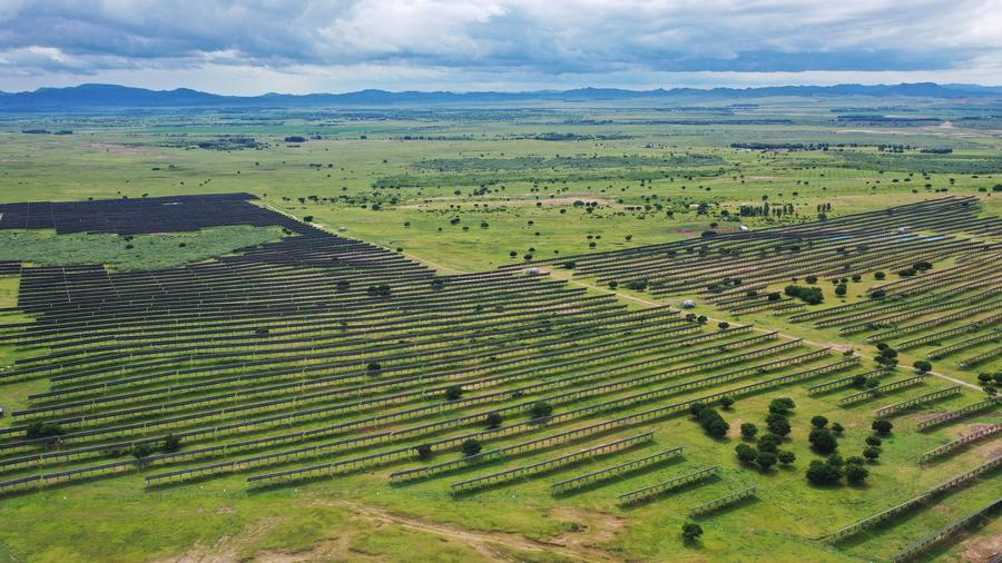 An aerial drone photo taken on July 29, 2025 shows photovoltaic panels at the site of a desertification control project integrated with wind and solar power facilities in Hinggan league, northern China's Inner Mongolia autonomous region. [Photo/Xinhua]
