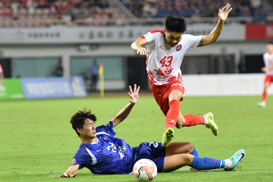 Lin Zehao (R) of Changsha hurdles a Loudi defender in a 2025 Hunan Football City League match in Changsha, central China's Hunan Province, on Sept. 7, 2025. (Xinhua/Chen Zhenhai)
