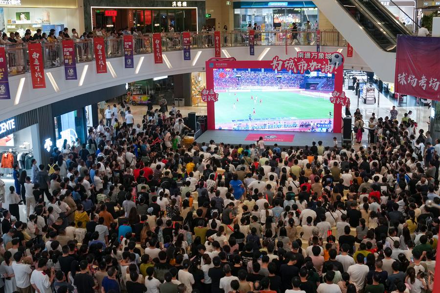 Spectators watch a match between Nantong and Suqian in the 2025 Jiangsu Football City League on a big screen in a mall in Nantong, east China's Jiangsu Province, on June 29, 2025. (Xinhua/Li Bo)