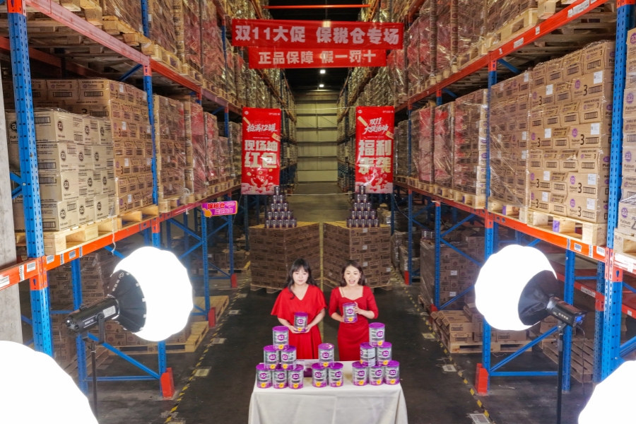 A livestreaming promotion takes place at a warehouse of the Jinyi Comprehensive Bonded Zone in Jinhua, Zhejiang province, on Monday, the eve of Singles Day. CHINA DAILY