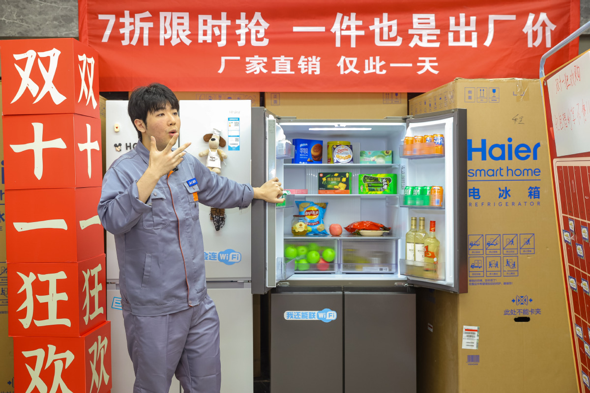 A salesman livestreams to promote refrigerators in Qingdao, Shandong, on Monday. ZHANG YING/FOR CHINA DAILY
