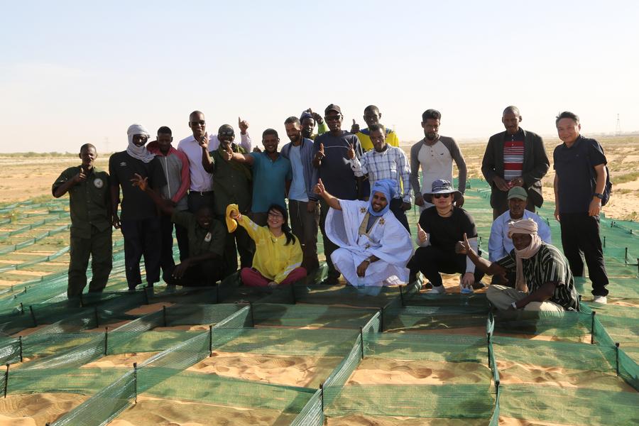 Researchers from the Xinjiang Institute of Ecology and Geography under the Chinese Academy of Sciences and local workers pose for a group photo at the China-Africa Green Technology Park in Trarza region, western Mauritania, in May 2024. (Photo by Zhou Na/Xinhua)