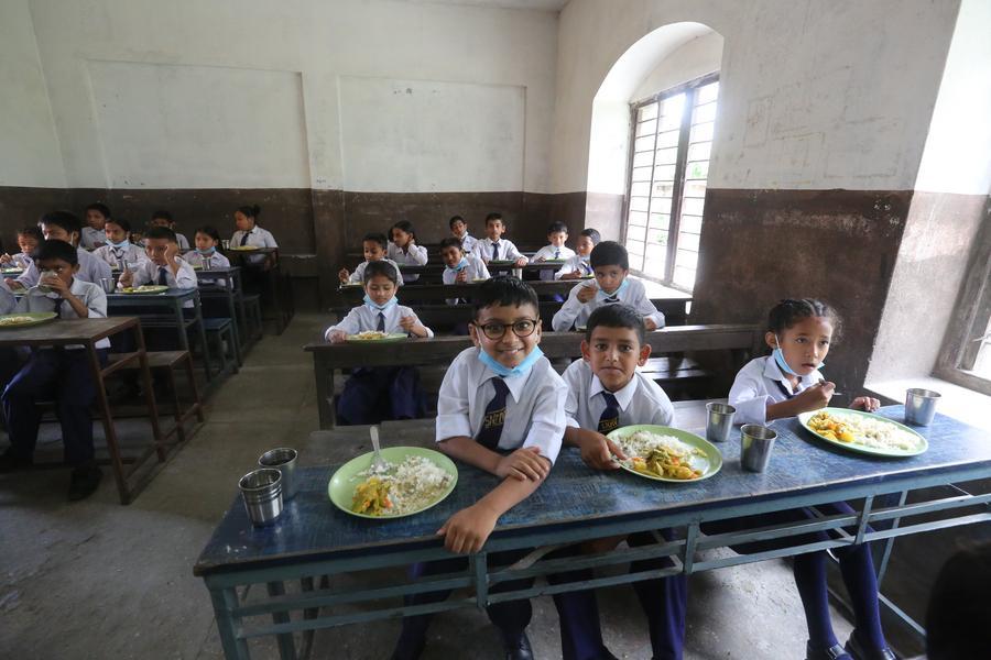 Students have lunch in a dining room following the launch ceremony of Nepal Smiling Children Project funded by the Global Development and South-South Cooperation Fund in Kathmandu, Nepal, July 11, 2022. (Xinhua/Yi Aijun)