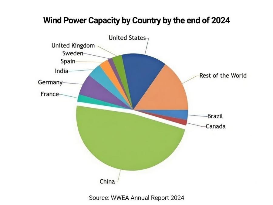 China has played an extraordinary role in advancing global wind power, adding 79.8 million kW of new capacity in 2024 -- up from 75.9 million kW in 2023. China accounts for 72 percent of the global market for new wind turbines -- a steady increase from 65 percent in 2023 and 58 percent in 2022, according to a report from the World Wind Energy Association (WWEA).