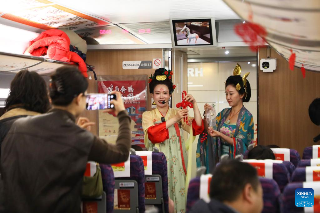 Museum staff members introduce cultural knowledge to passengers aboard the train G848 in northwest China's Gansu Province, Feb. 9, 2026. As part of the mobile museum on the high-speed railway program, the train G848, carrying cultural relics interpreters, departed from Lanzhou West Railway Station heading to Guangzhou South Railway Station on Monday. Nine of China's national first-grade museums in Gansu, including the Dunhuang Academy and Gansu Provincial Museum, have brought the cultural heritage of Gansu onto the train, allowing passengers to touch history and get to know traditional custom during the Spring Festival travel rush. [Photo/Xinhua]