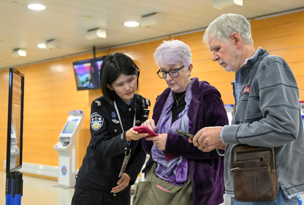 A border inspection police officer helps foreign tourists fill in entry information at Shanghai Pudong International Airport in Shanghai, east China, Feb. 11, 2026. (Xinhua/Chen Haoming)