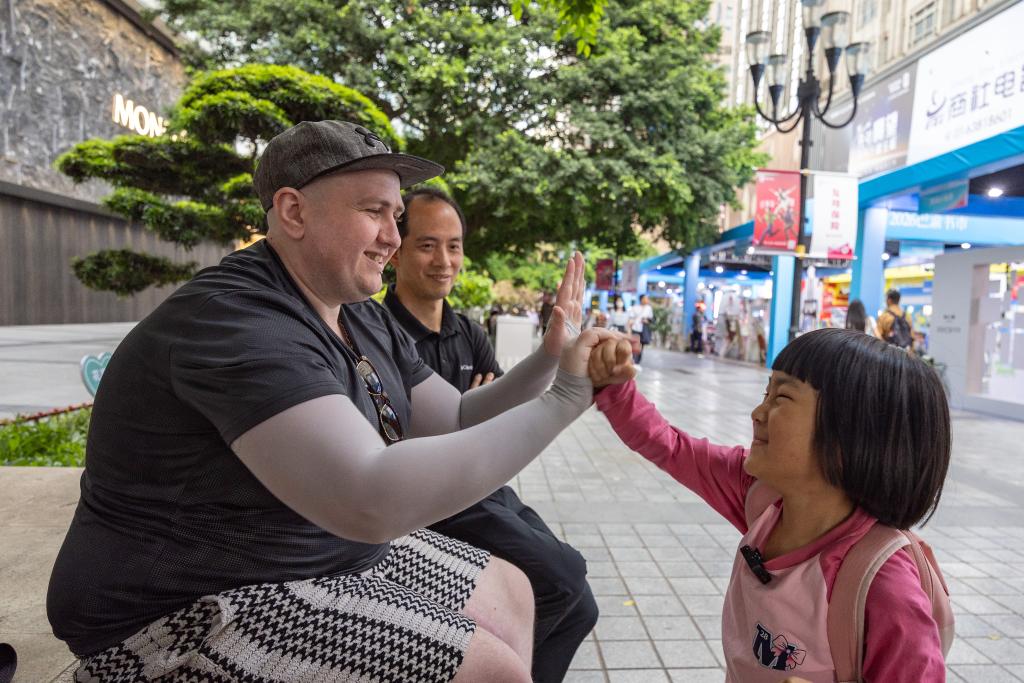 A Chinese girl interacts with a tourist from Ireland at Jiefangbei, a business area, in Yuzhong District of Chongqing, southwest China, April 22, 2026. (Xinhua/Huang Wei)