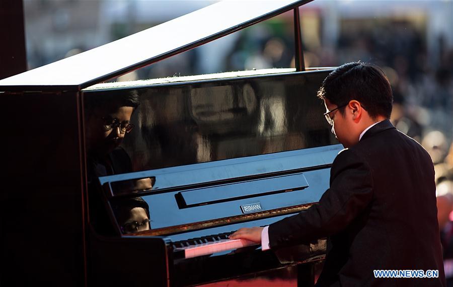 A young performer plays the piano to celebrate the upcoming Chinese Lunar New Year in Piazza del Popolo of Rome, Italy, Feb. 10, 2018. [Photo/Xinhua]