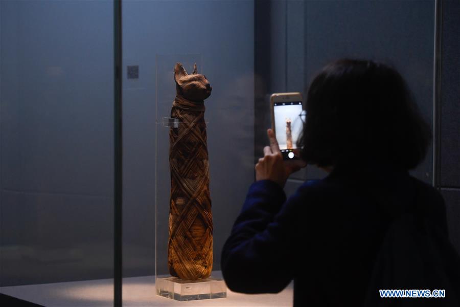 A visitor takes pictures of a cat mummy displayed in an exhibition of ancient Egyptian civilization at Zhejiang West Lake Gallery in Hangzhou, capital of east China's Zhejiang Province, Jan. 30, 2019. A total of 180 cultural relics from Italian museums are displayed in an exhibition of ancient Egyptian civilization from Jan. 22 to May 5, 2019. [Photo/Xinhua]