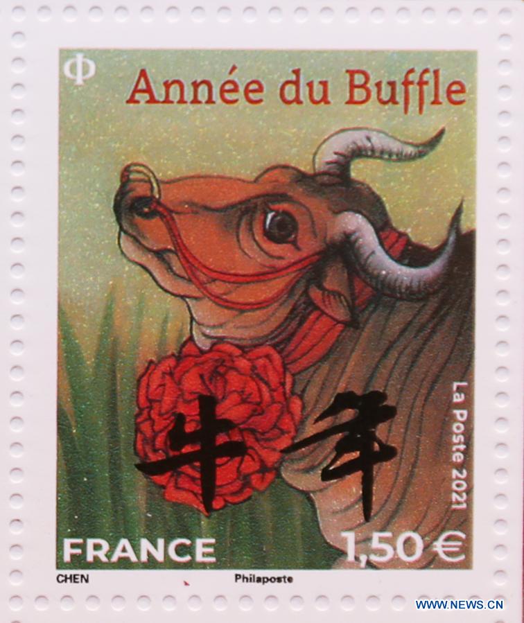 La Poste, the French post office, on Saturday issued two stamps to celebrate the upcoming Chinese Lunar New Year of Ox, which falls on Feb. 12 this year.
