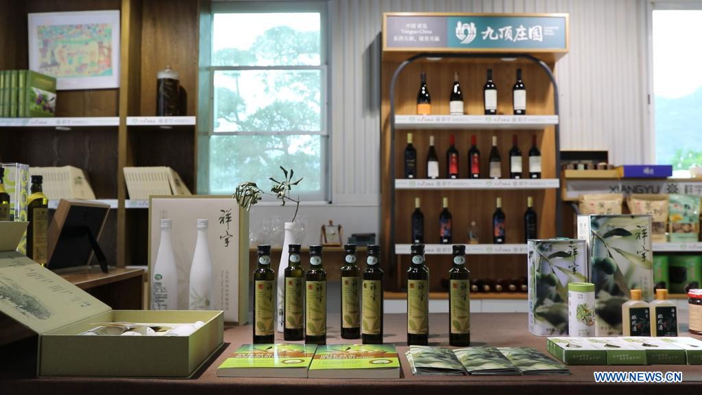 Olive oil samples produced by a company are pictured in Longnan City, northwest China's Gansu Province, June 22, 2021. When an international olive oil competition announced its winners in Greece in late June, excitement rippled across the village of Daoqi in northwest China. "The award-winning olive oil was made from our fruit," said Ru Ciming, 50, an olive planter from the village under the city of Longnan, Gansu Province. (Xinhua/Zhang Wenjing)