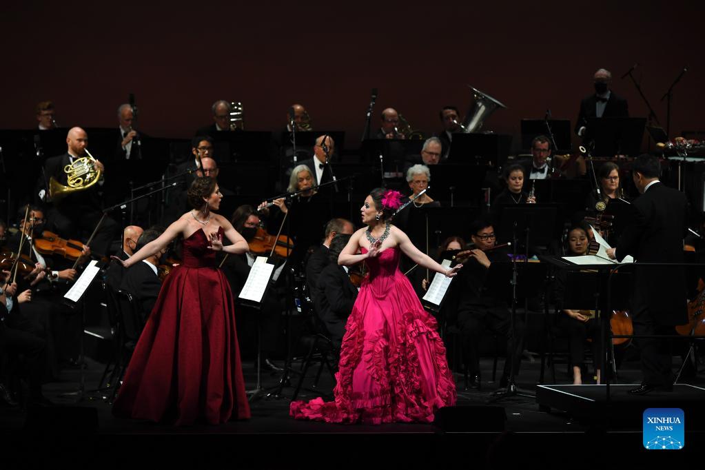 Soprano Esther Maureen Kelly (L, front) and coloratura soprano Holly Flack (R, front) sing during the concert "East/West: A Symphonic Celebration" at Lincoln Center in New York, the United States, Nov. 13, 2021. (Xinhua/Li Rui)