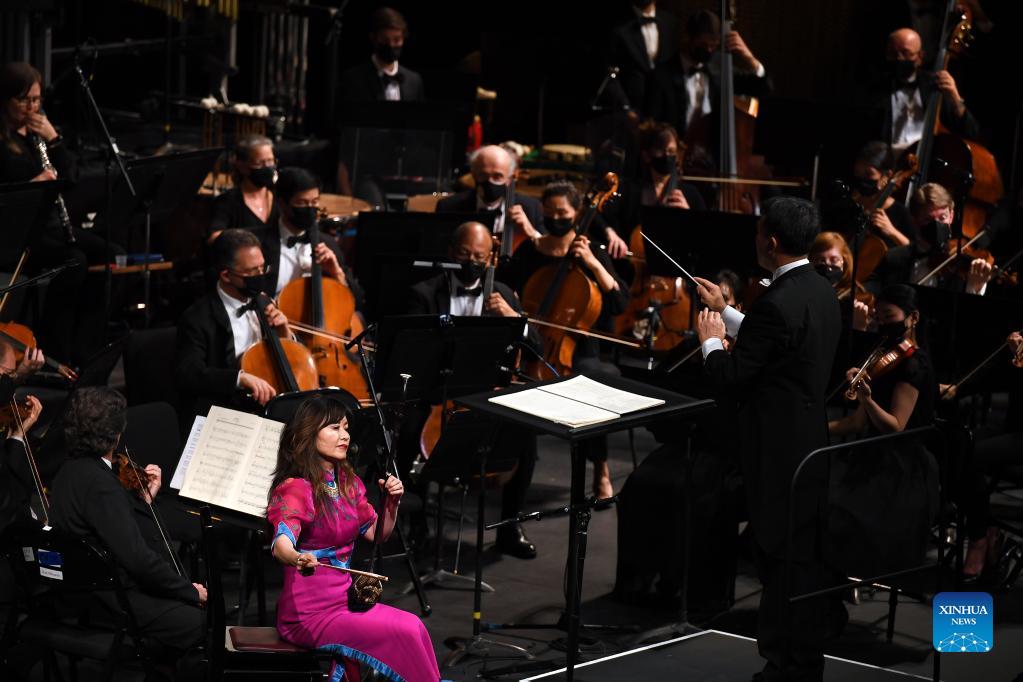 Erhu virtuoso Chen Jiebing (L, front) and the New York City Ballet Orchestra perform during the concert "East/West: A Symphonic Celebration" at Lincoln Center in New York, the United States, Nov. 13, 2021. A concert held in New York City's Lincoln Center on Saturday night charmed the audience with multiple Chinese musical pieces. The concert is part of "Image China," a cultural exchange initiative presented by China Arts and Entertainment Group, which aims to introduce traditional and contemporary Chinese performing arts to audiences around the world. (Xinhua/Li Rui)
