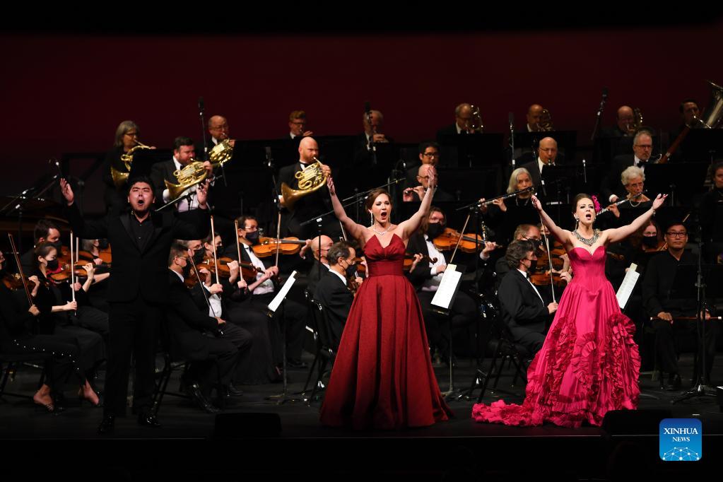 Bass William Guanbo Su (L, front), Soprano Esther Maureen Kelly (C, front) and coloratura soprano Holly Flack (R, front) perform during the concert "East/West: A Symphonic Celebration" at Lincoln Center in New York, the United States, Nov. 13, 2021. A concert held in New York City's Lincoln Center on Saturday night charmed the audience with multiple Chinese musical pieces. The concert is part of "Image China," a cultural exchange initiative presented by China Arts and Entertainment Group, which aims to introduce traditional and contemporary Chinese performing arts to audiences around the world. (Xinhua/Li Rui)