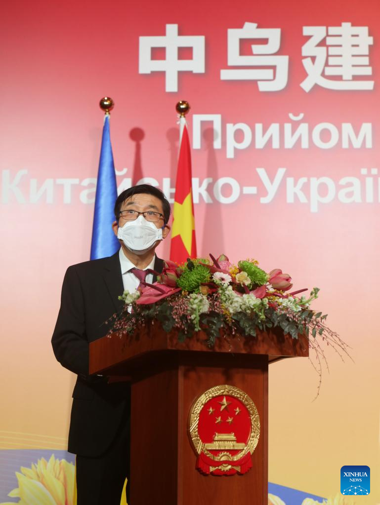 Chinese Ambassador Fan Xianrong speaks at a reception marking the 30th anniversary of the establishment of China-Ukraine diplomatic ties in Kiev, Ukraine, Jan. 18, 2022. The Chinese Embassy in Ukraine held a reception on Tuesday to celebrate the 30th anniversary of the establishment of China-Ukraine diplomatic ties. (Photo by Sergey Starostenko/Xinhua)