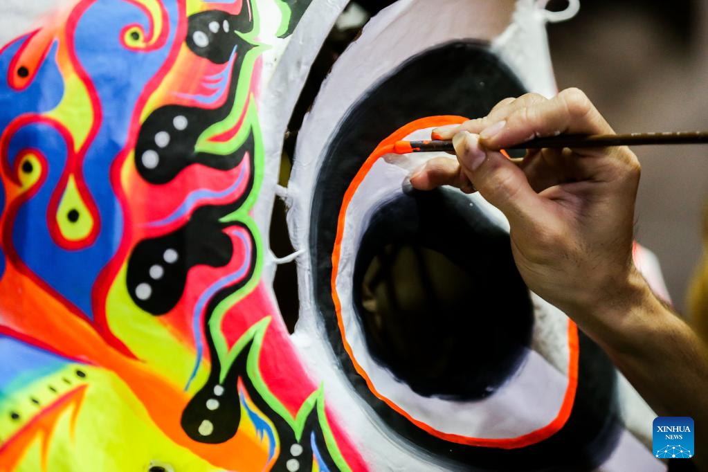 A member of a costume workshop paints a lion head costume in Manila, the Philippines, Jan. 24, 2022. Although most of performances for the upcoming Chinese lunar New Year celebrations are canceled in Manila due to epidemic prevention and control measures, local dragon and lion costume workshops still work on creations for customers who are ready to buy or rent the costumes to display. (Xinhua/Rouelle Umali)