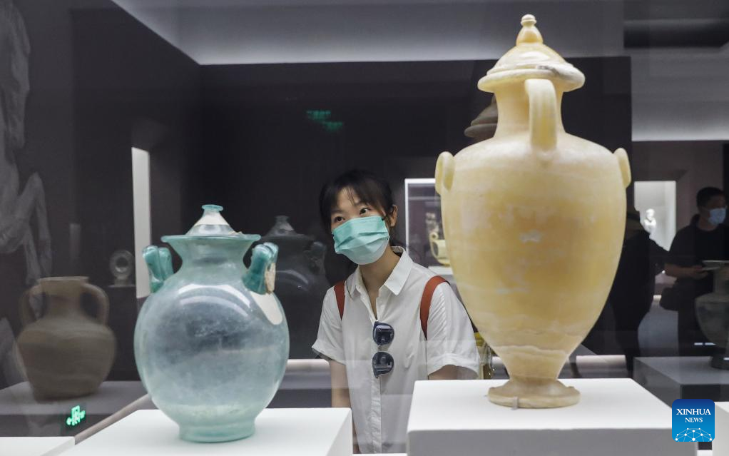 A visitor views exhibits at the exhibition titled "Tota Italia -- Origins of a Nation" at the National Museum of China in Beijing, capital of China, July 11, 2022.