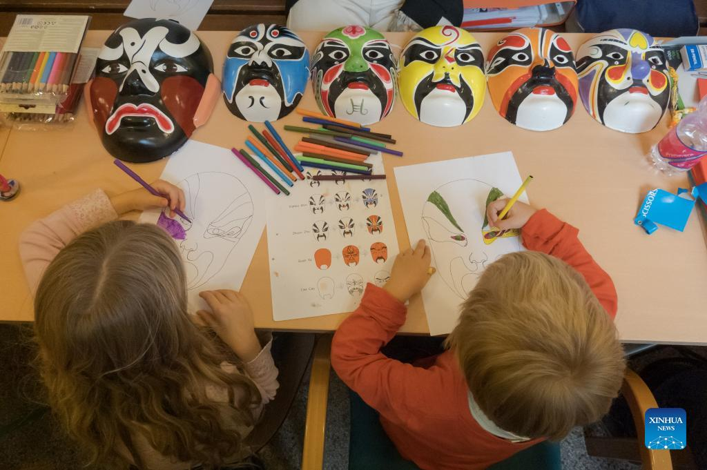 Children color Peking Opera facial makeup patterns during a Confucius Day event hosted by the Confucius Institute at the Eotvos Lorand University (ELTE) in Budapest, Hungary, on Sept. 24, 2022. The Confucius Institute at ELTE of the Hungarian capital celebrated the birthday of Confucius with rich cultural programs here on Saturday. (Photo by Attila Volgyi/Xinhua)