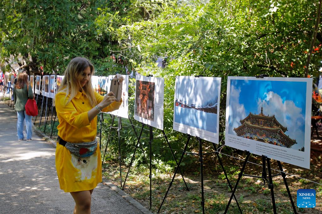 A woman takes pictures of a photo exhibition of ancient Chinese imperial palaces and gardens during the 9th Asia Fest in the National Park in Bucharest, capital of Romania, Sept. 24, 2022. The three-day festival includes a number of activities such as product exhibitions and sales from various countries, food experience, art performances, cultural exhibitions, film festivals, and handicraft workshops. (Photo by Cristian Cristel/Xinhua)