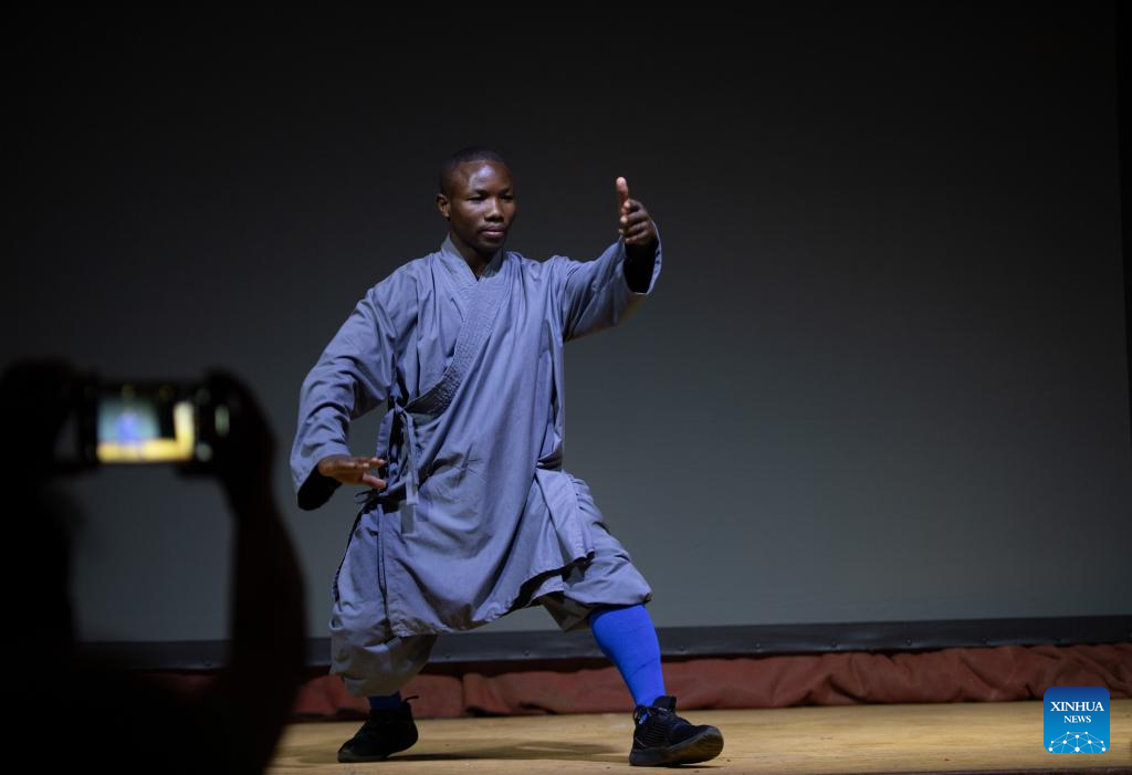 A Kenyan student performs Chinese Kongfu during a Chinese cultural event held at the Kenya National Theater in Nairobi, Kenya on Nov. 28, 2022. Launched by the Chinese Embassy in Kenya, Kenya Cultural Center and Confucius Institute at the University of Nairobi, an event themed with Chinese opera was held at the Kenya National Theater on Monday in Nairobi. A series of activities enables attendees to have a better knowledge of Chinese opera and experience the charm of traditional Chinese culture. (Xinhua/Li Yahui)