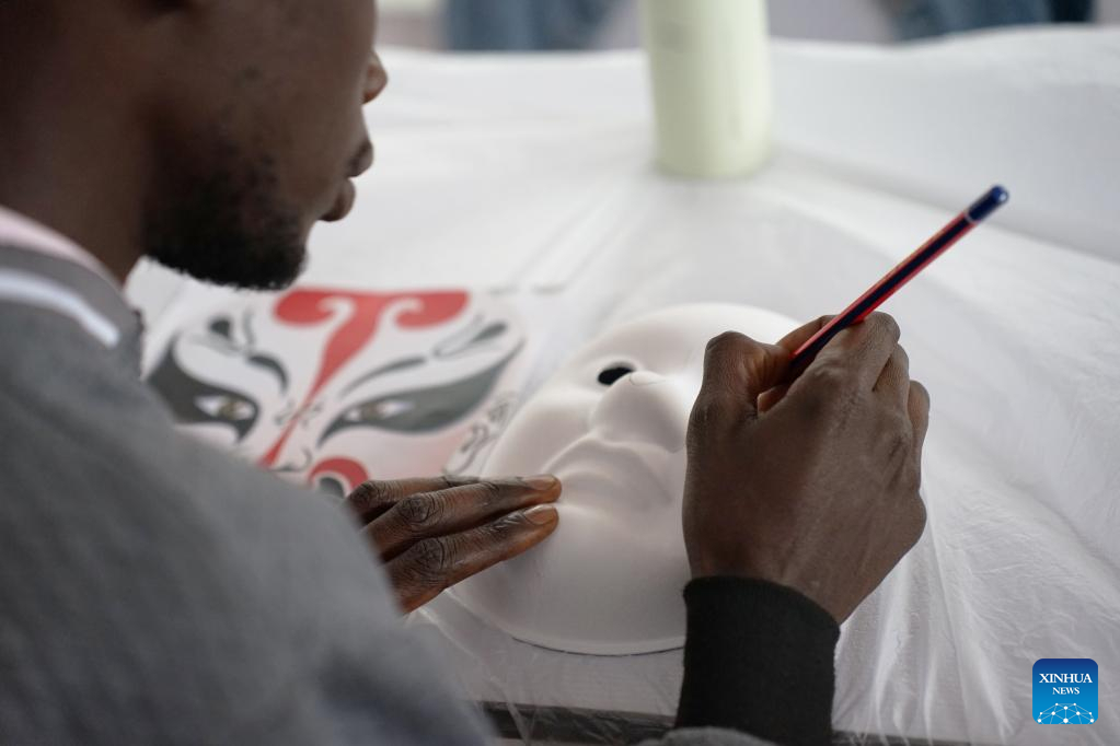 A Kenyan tries to draw an opera mask during a Chinese cultural event held at the Kenya National Theater in Nairobi, Kenya on Nov. 28, 2022. Launched by the Chinese Embassy in Kenya, Kenya Cultural Center and Confucius Institute at the University of Nairobi, an event themed with Chinese opera was held at the Kenya National Theater on Monday in Nairobi. A series of activities enables attendees to have a better knowledge of Chinese opera and experience the charm of traditional Chinese culture. (Xinhua/Li Yahui)