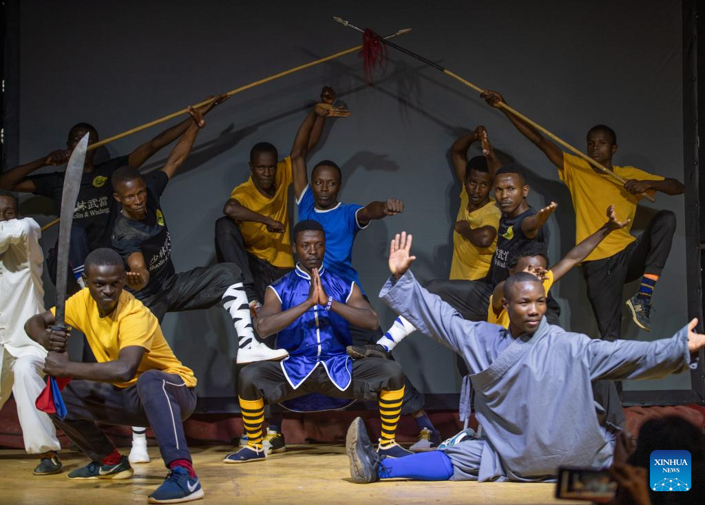 Kenyan students perform Chinese Kongfu during a Chinese cultural event held at the Kenya National Theater in Nairobi, Kenya, Nov. 28, 2022. Launched by the Chinese Embassy in Kenya, Kenya Cultural Center and Confucius Institute at the University of Nairobi, an event themed with Chinese opera was held at the Kenya National Theater on Monday in Nairobi. A series of activities enables attendees to have a better knowledge of Chinese opera and experience the charm of traditional Chinese culture. (Xinhua/Li Yahui)