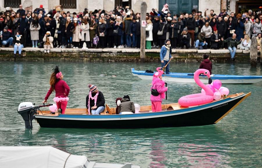 People attend a water parade of the Venice Carnival in Venice, Italy, on Feb. 5, 2023. (Xinhua/Jin Mamengni)
