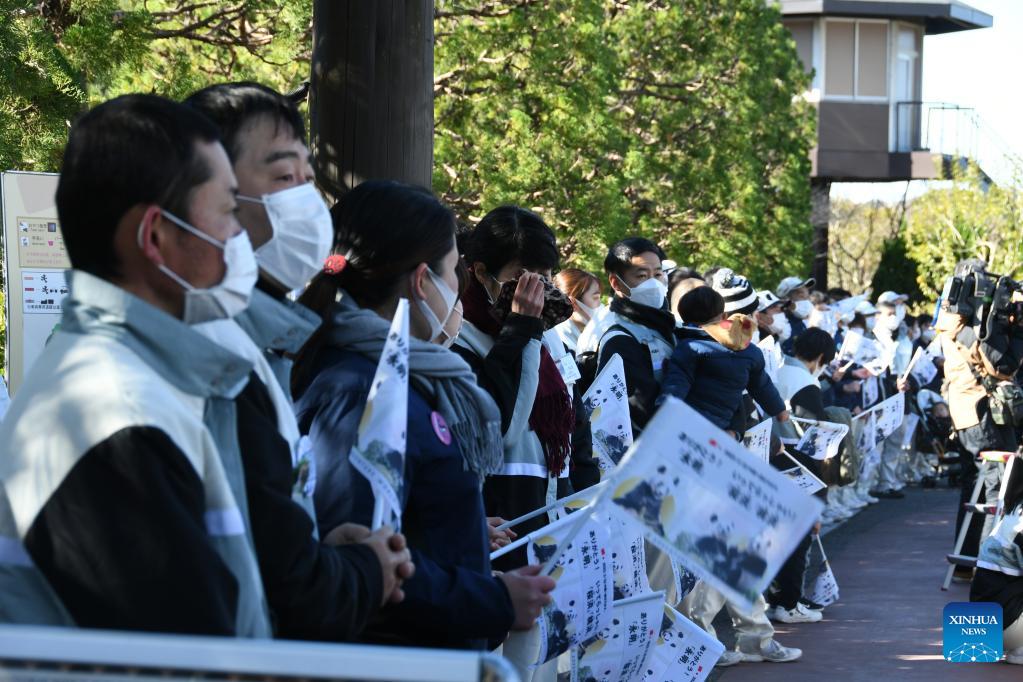 Staff members line up to bid farewell to giant pandas Eimei, Ouhin and Touhin at Adventure World in Shirahama, Wakayama prefecture, Japan, Feb. 22, 2023. (Xinhua/Yue Chenxing)