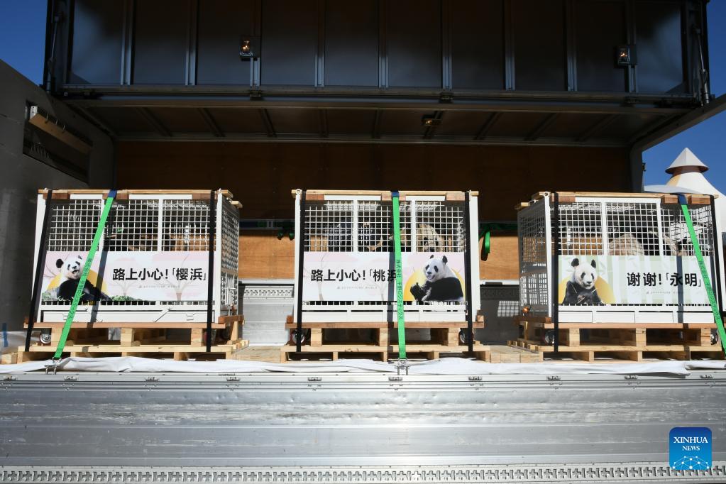 Giant pandas Ouhin, Touhin and Eimei (L-R) are about to set off for China at Adventure World in Shirahama, Wakayama prefecture, Japan, Feb. 22, 2023. (Xinhua/Yue Chenxing)
