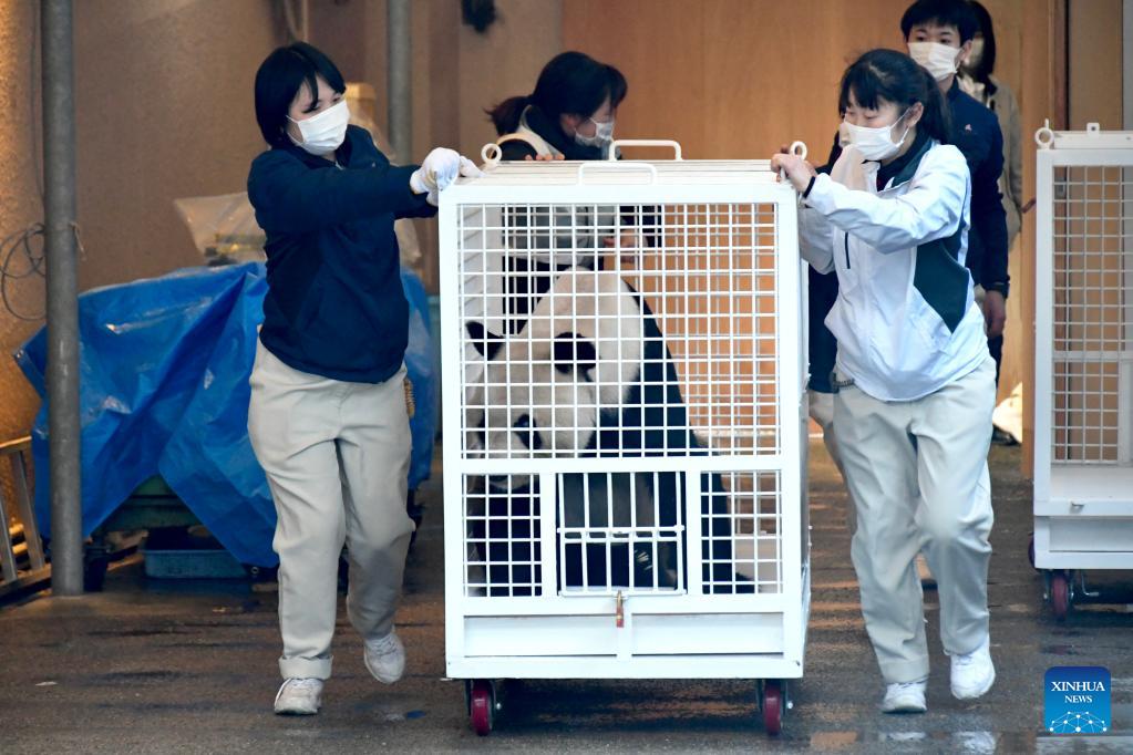 Staff members transfer giant panda Eimei at Adventure World in Shirahama, Wakayama prefecture, Japan, Feb. 22, 2023. (Xinhua/Yue Chenxing)