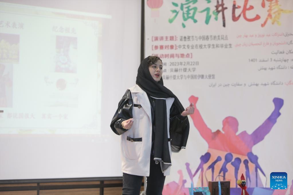 A contestant speaks at the first Chinese speech competition for Iranian college students in Tehran, Iran, Feb. 22, 2023. (Xinhua/Gao Wencheng)