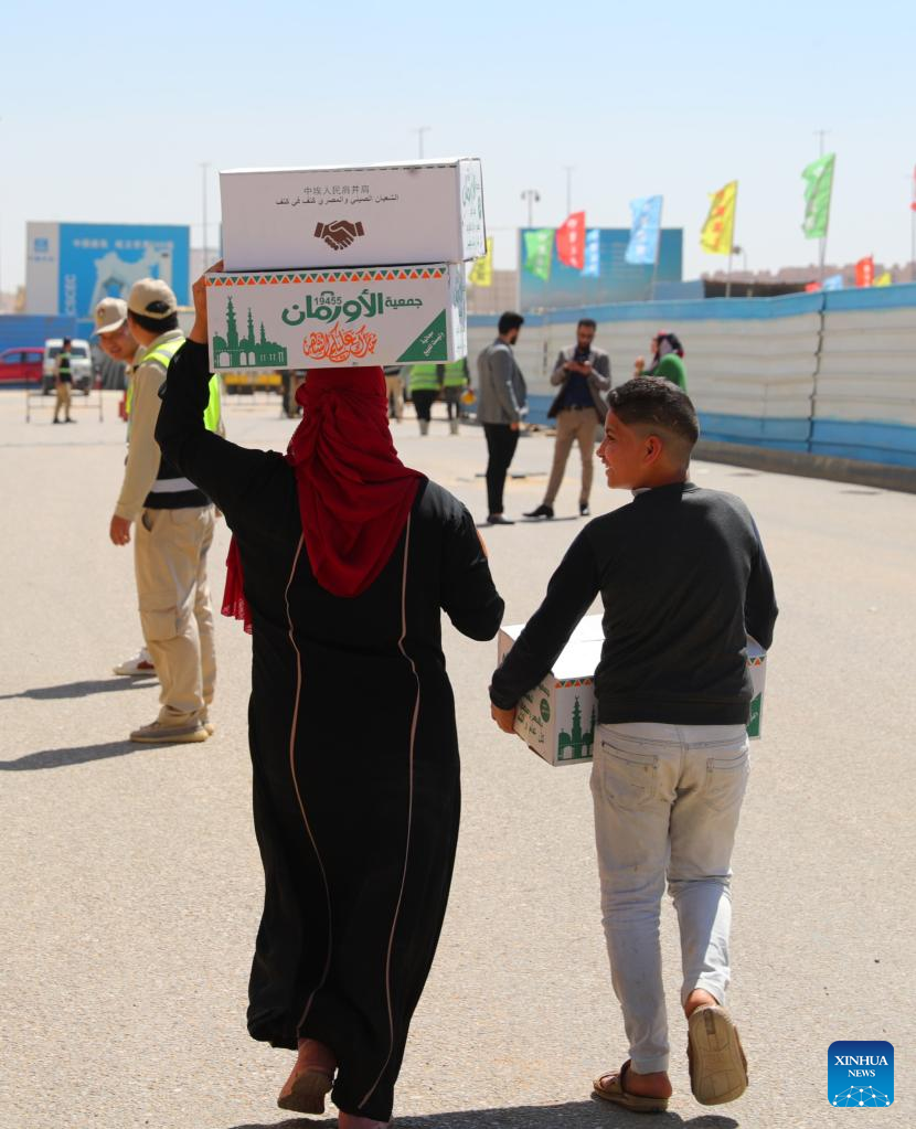 People carry boxes of donated food during a charity event in Cairo, Egypt, on April 16, 2023. The Chinese Embassy in Egypt and the Chinese Chamber of Commerce in Egypt organized a food distribution event on Sunday for needy Egyptians during Ramadan. (Xinhua/Sui Xiankai)