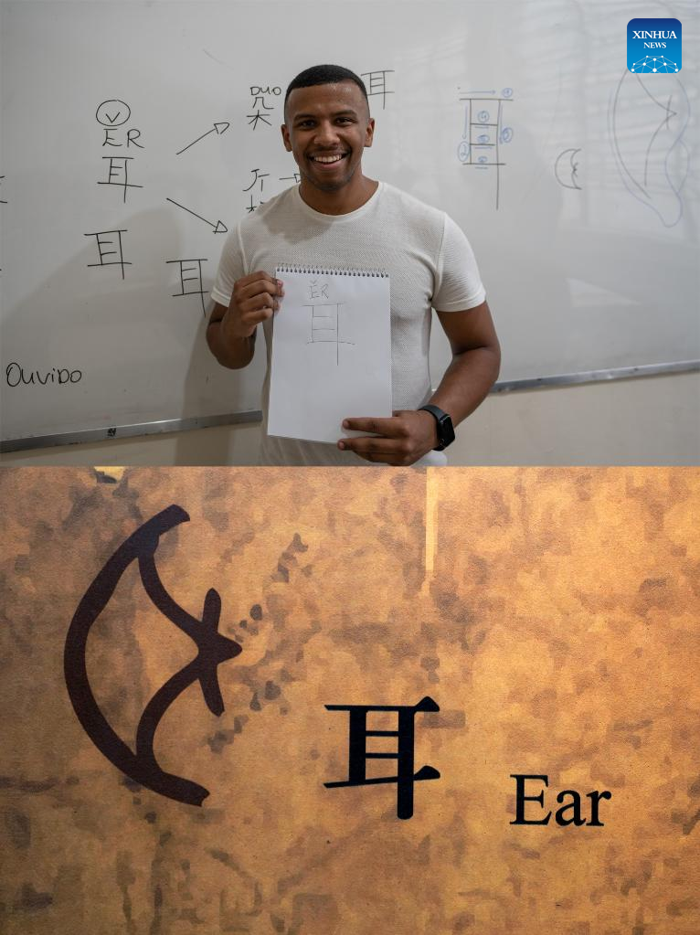 This combo photo shows Guilherme, a Chinese teacher from Brazil, demonstrating the Chinese character "Er", meaning "Ear", in Rio de Janeiro, Brazil, April 18, 2023 (upper, photo taken by Wang Tiancong), and the oracle bone script character "Er" (L), meaning "ear", pictured at the National Museum of Chinese Writing in Anyang, central China's Henan Province on April 19, 2023 (lower, photo taken by Li An). The UN Chinese Language Day is observed on April 20 every year since 2010, celebrating the language's contribution to the world while encouraging more people to learn it. (Xinhua)