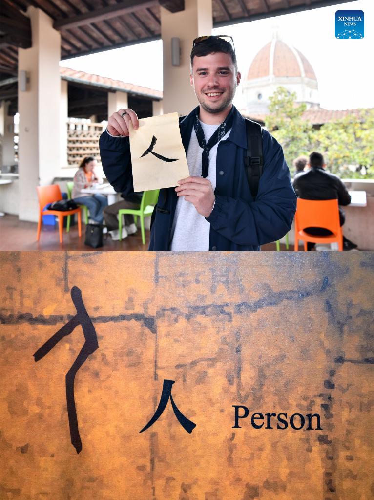 This combo photo shows Chinese culture enthusiast Filippo demonstrating the Chinese character "Ren", meaning "person", at an activity held by the Confucius Institute at the University of Florence in Florence, Italy, April 13, 2023 (upper, photo taken by Jin Mamengni), and the oracle bone script character "Ren" (L), meaning "person", pictured at the National Museum of Chinese Writing in Anyang, central China's Henan Province on April 19, 2023 (lower, photo taken by Li An). The UN Chinese Language Day is observed on April 20 every year since 2010, celebrating the language's contribution to the world while encouraging more people to learn it. (Xinhua)