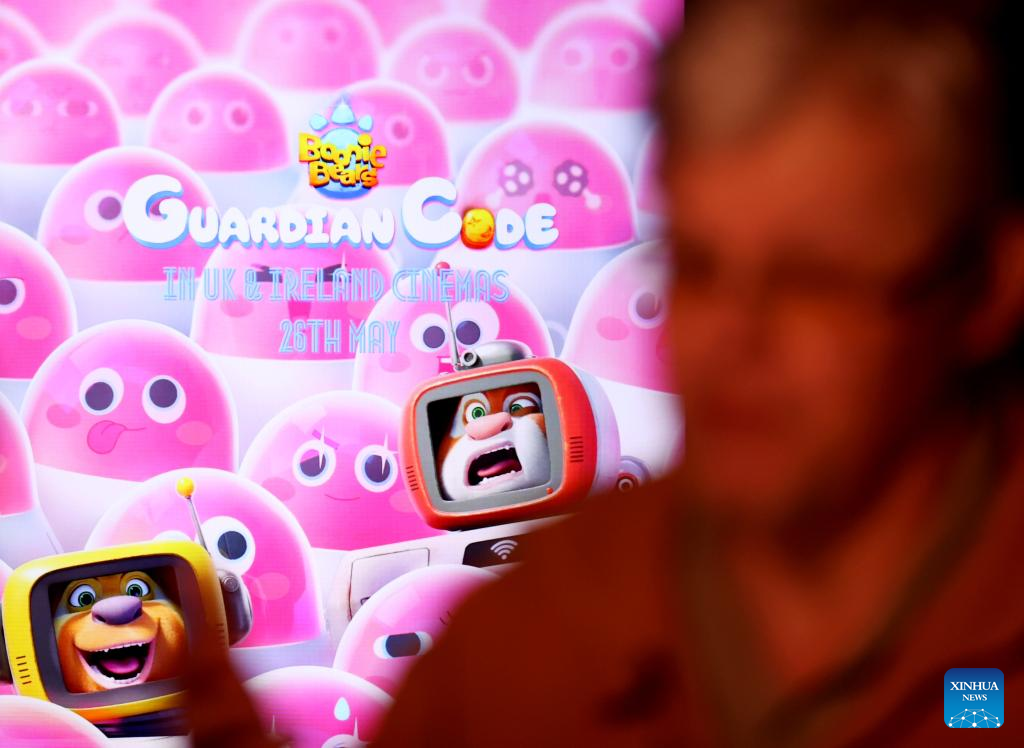 A man stands in front of an electronic poster prior to a press screening of the movie "Guardian Code" in London, Britain, on April 26, 2023. A Chinese animated family movie will be on screens in over 300 cinemas across the United Kingdom (UK) and Ireland on May 26. The English-dubbed movie "Guardian Code" is an installment of "Boonie Bears," which is an animated movie series widely recognized by children in China. (Xinhua/Li Ying)