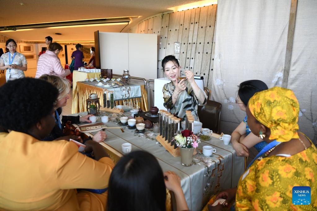 Guests watch a traditional tea ceremony during a Chinese cultural event at the Palais des Nations in Geneva, Switzerland, on May 2, 2023. The event, "Appreciating Masterpieces of Calligraphy and Painting and Sharing the Beautiful Future," included exhibitions of Chinese traditional paintings and calligraphy works, and also offered guests the chance to watch a traditional tea ceremony and taste Chinese gourmet snacks. (Xinhua/Lian Yi)