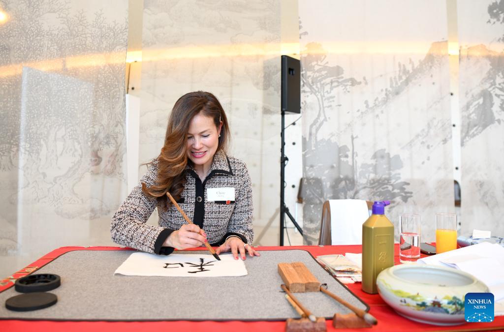 Claire Bostock Tang, wife of World Intellectual Property Organization (WIPO) Director General Daren Tang, writes a Chinese character meaning "togetherness", "harmony" and "interconnectedness" on rice paper during a Chinese cultural event at the Palais des Nations in Geneva, Switzerland, on May 2, 2023. The event, "Appreciating Masterpieces of Calligraphy and Painting and Sharing the Beautiful Future," included exhibitions of Chinese traditional paintings and calligraphy works, and also offered guests the chance to watch a traditional tea ceremony and taste Chinese gourmet snacks. (Xinhua/Lian Yi)