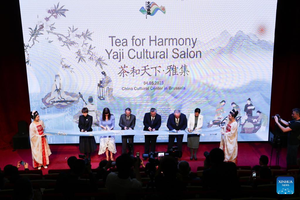 Delegates cut the ribbon during an opening ceremony of Yaji Cultural Salon "Tea for Harmony" at China Cultural Center in Brussels, Belgium, on May 4, 2023. A cultural salon focusing on traditional Chinese tea making techniques and social practices will open to the public on Friday after an opening ceremony held Thursday at the China Cultural Center in Brussels. (Xinhua/Zheng Huansong)