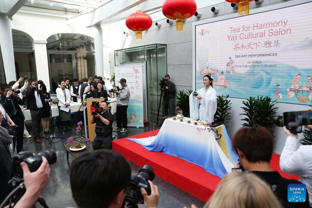 People watch tea art performance during an opening ceremony of Yaji Cultural Salon "Tea for Harmony" at China Cultural Center in Brussels, Belgium, on May 4, 2023. A cultural salon focusing on traditional Chinese tea making techniques and social practices will open to the public on Friday after an opening ceremony held Thursday at the China Cultural Center in Brussels. (Xinhua/Zheng Huansong)