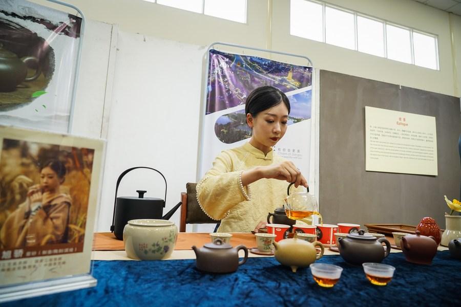 The tea ceremony is demonstrated in Kathmandu, Nepal, May 16, 2023. (Photo by Hari Maharjan/Xinhua)
