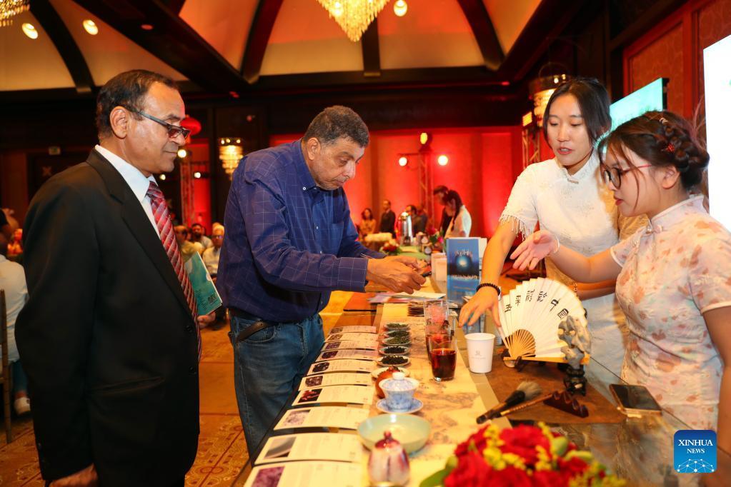 People learn about tea culture at a Chinese tea culture event in Cairo, Egypt, on May 25, 2023. A tea-themed cultural salon was held on Thursday in the Egyptian capital of Cairo, with more than 200 people gathering to taste famous Chinese tea, experience tea-making art, and enjoy cultural performances. (Xinhua/Sui Xiankai)