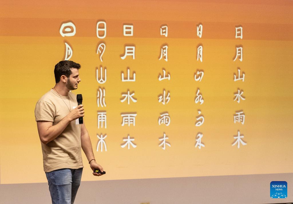 A contestant makes a speech during the "Chinese Bridge" language proficiency competition for Israeli university students in Haifa, Israel, on June 8, 2023. The 22nd "Chinese Bridge" language proficiency competition for Israeli university students concluded on Thursday in the country's northern city of Haifa. (Xinhua/Chen Junqing)