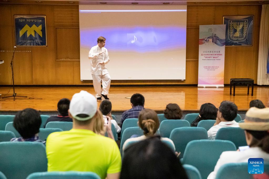 A contestant performs during the "Chinese Bridge" language proficiency competition for Israeli university students in Haifa, Israel, on June 8, 2023. The 22nd "Chinese Bridge" language proficiency competition for Israeli university students concluded on Thursday in the country's northern city of Haifa. (Xinhua/Chen Junqing)