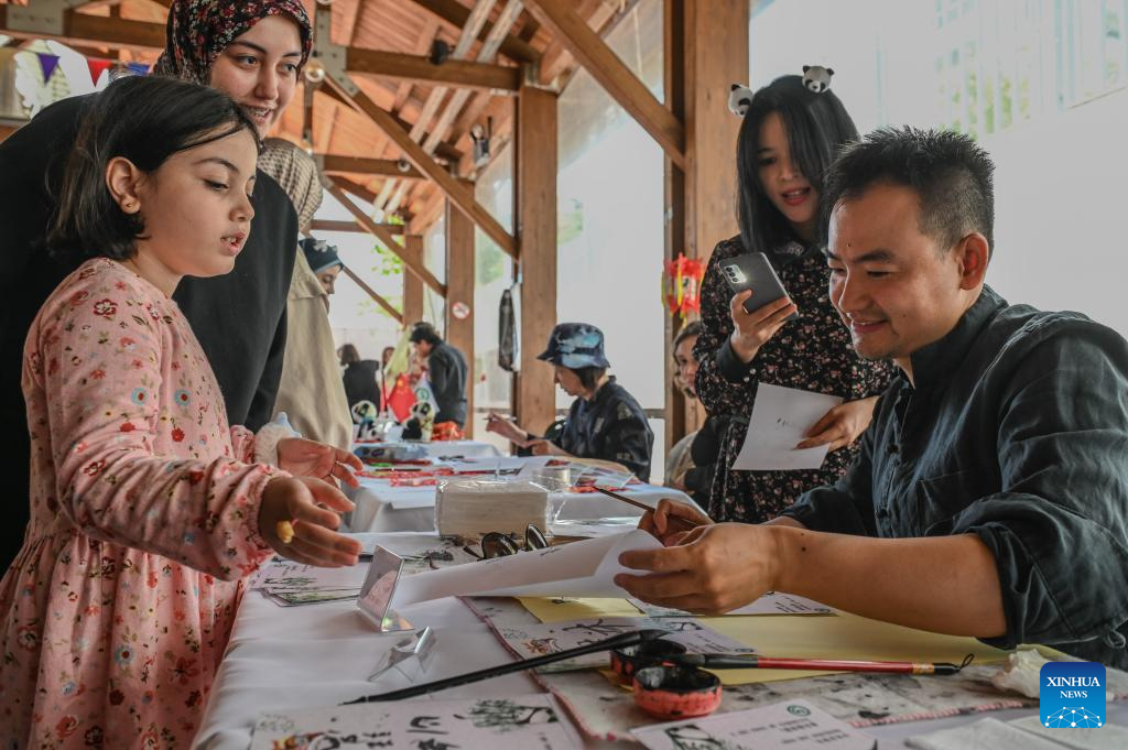 Guests learn about Chinese Calligraphy during a celebration marking the upcoming traditional Chinese Dragon Boat Festival in Istanbul, Türkiye, June 15, 2023. (Photo by Omer Kuscu/Xinhua)