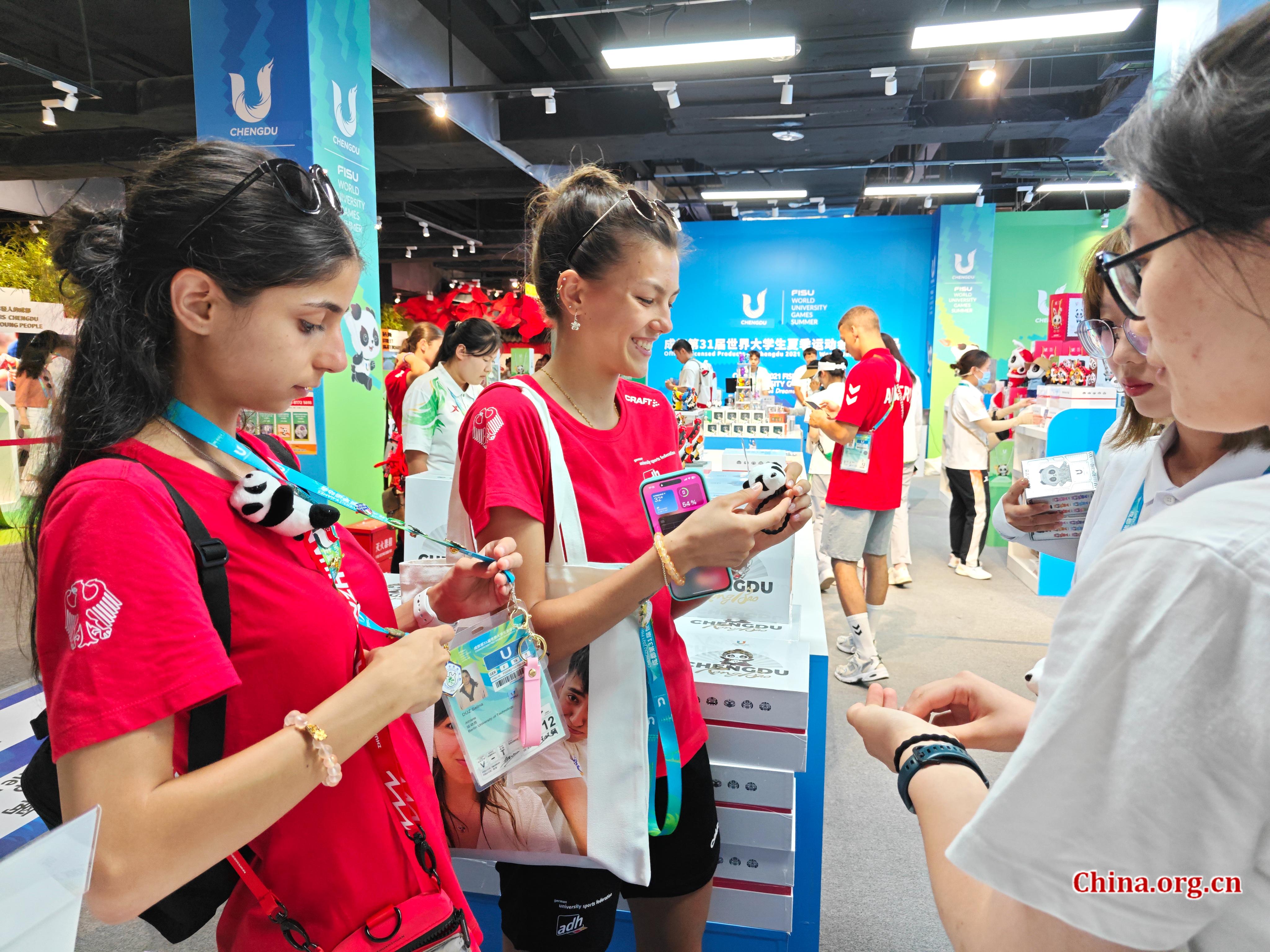 Athletes and volunteers exchange pins at the Chengdu Universiade Village, July 29, 2023. [Photo by Wang Yiming/China.org.cn]