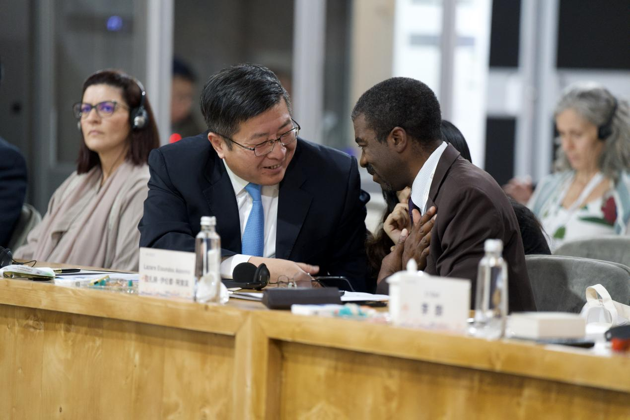 Tan Xuxiang, vice mayor of Beijing, talks with Lazare Eloundou Assomo, director of the UNESCO World Heritage Centre during the side event on "Digital Empowerment of Cultural Heritage" in Riyadh, Saudi Arabia on Sept. 17, 2023. [Photo provided to China.org.cn]