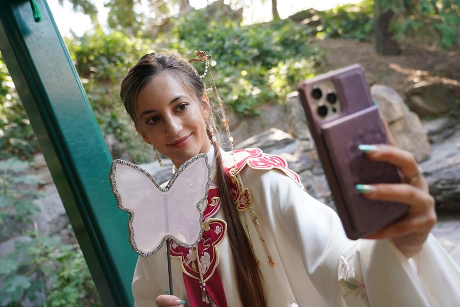 JongMay Urbonya takes a selfie at Beihai Park in Beijing, capital of China, Sept. 19, 2022. (Xinhua/Ma Xiaodong)