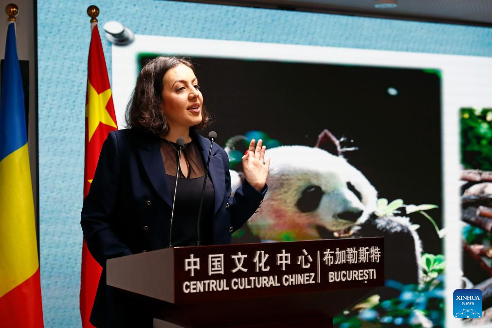Professional guide Paula Toma addresses the audience during an event promoting winter tourism in China at the Chinese Cultural Centre in Bucharest, Romania, on Jan. 13, 2025. (Photo by Cristian Cristel/Xinhua)