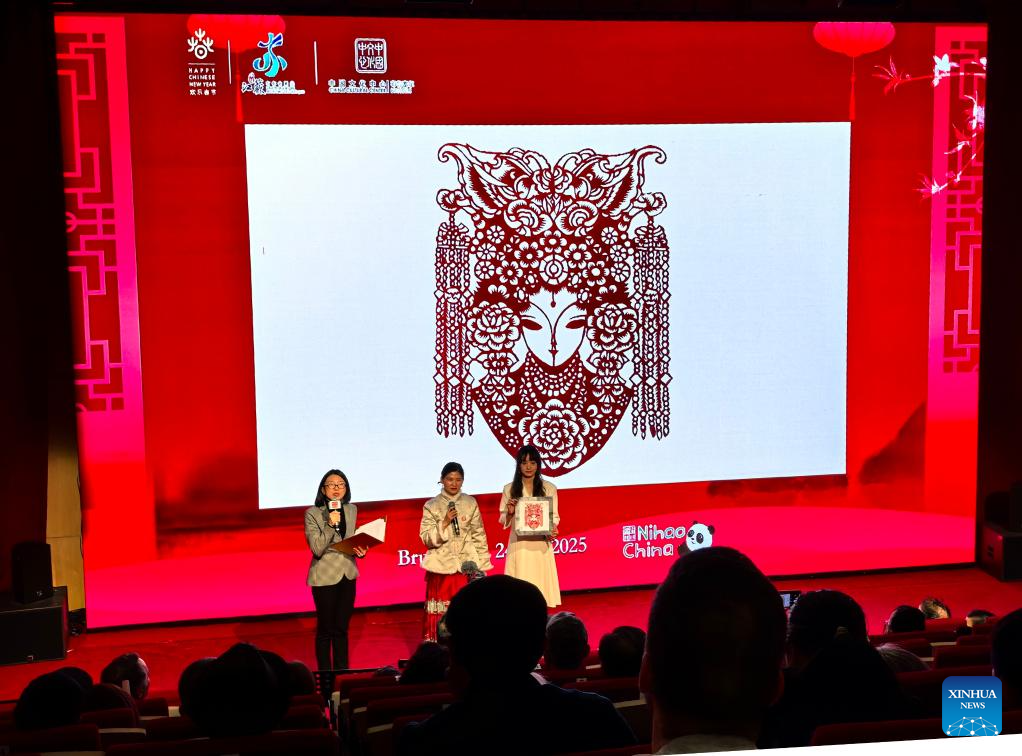 A piece of Jinling paper-cutting work is presented during a cultural tourism promotion event ahead of the Spring Festival, or the Chinese New Year, at the China Cultural Center in Brussels, Belgium, on Jan. 24, 2025. Various activities marking the upcoming Chinese New Year are being held in many countries around the world as the festival approaches. (Xinhua/Pan Geping)